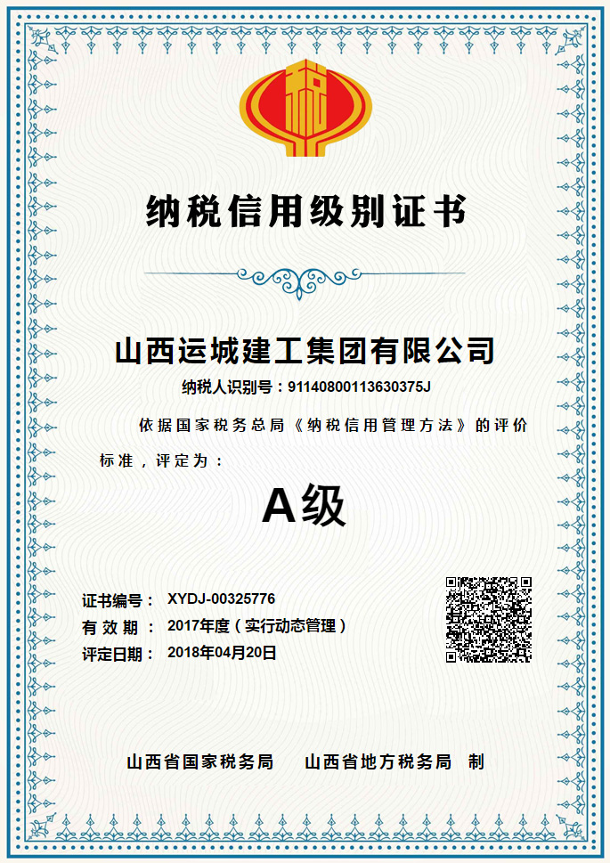 近日,山西省國家稅務(wù)局和山西省地方稅務(wù)局聯(lián)合發(fā)布《2017年度納稅信用評價A級納稅人名單》,我公司獲評納稅信用等級A級。自建筑施工企業(yè)2016年開始參加年度納稅信用等級評定以來,我公司首次獲得A級納稅人信用評定,這是稅務(wù)機關(guān)對公司依法納稅、誠信納稅工作的高度肯定及認可。